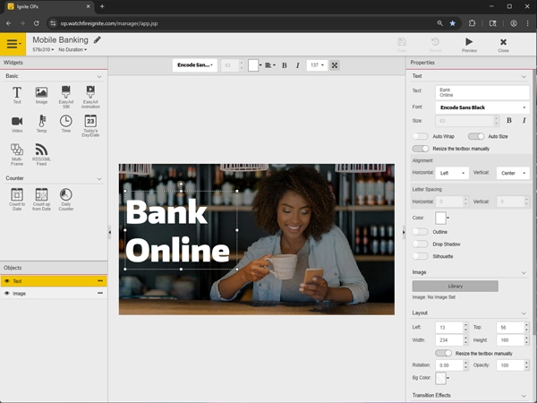 Upload images and videos, and use the versatile content editor to quickly create professional-looking messages. The editor is easy for users at all skill levels. You can experiment with the custom content editor tools and take advantage of Watchfire’s EasyArt library containing over 1000 different animations and still images.